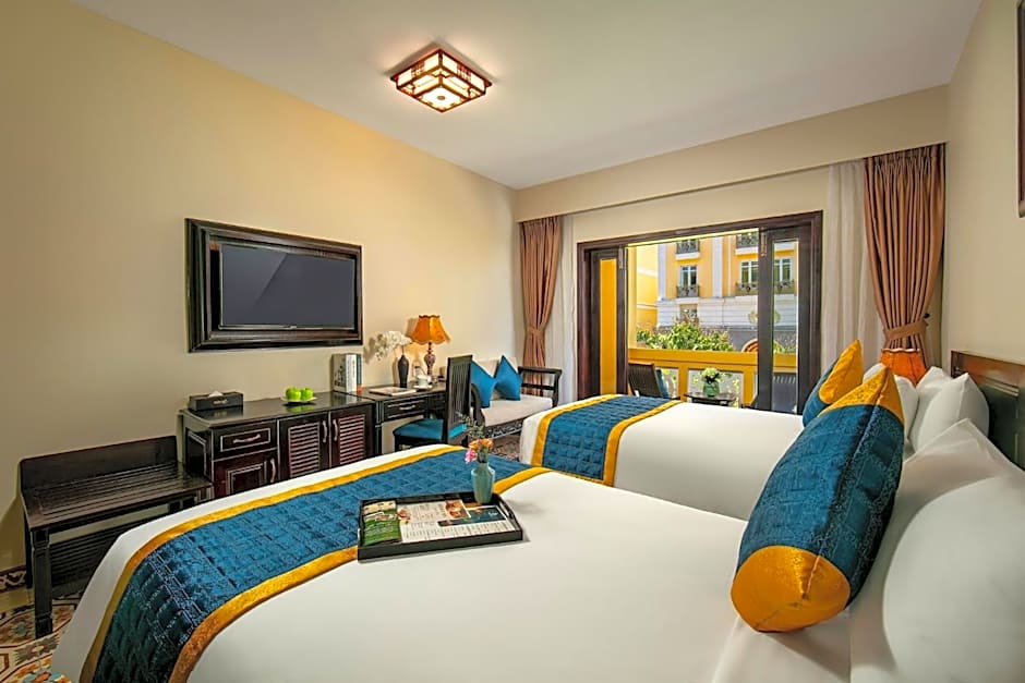 The spacious twin/double room features air conditioning, soundproof walls, a balcony with garden views as well as a private bathroom boasting a bath.